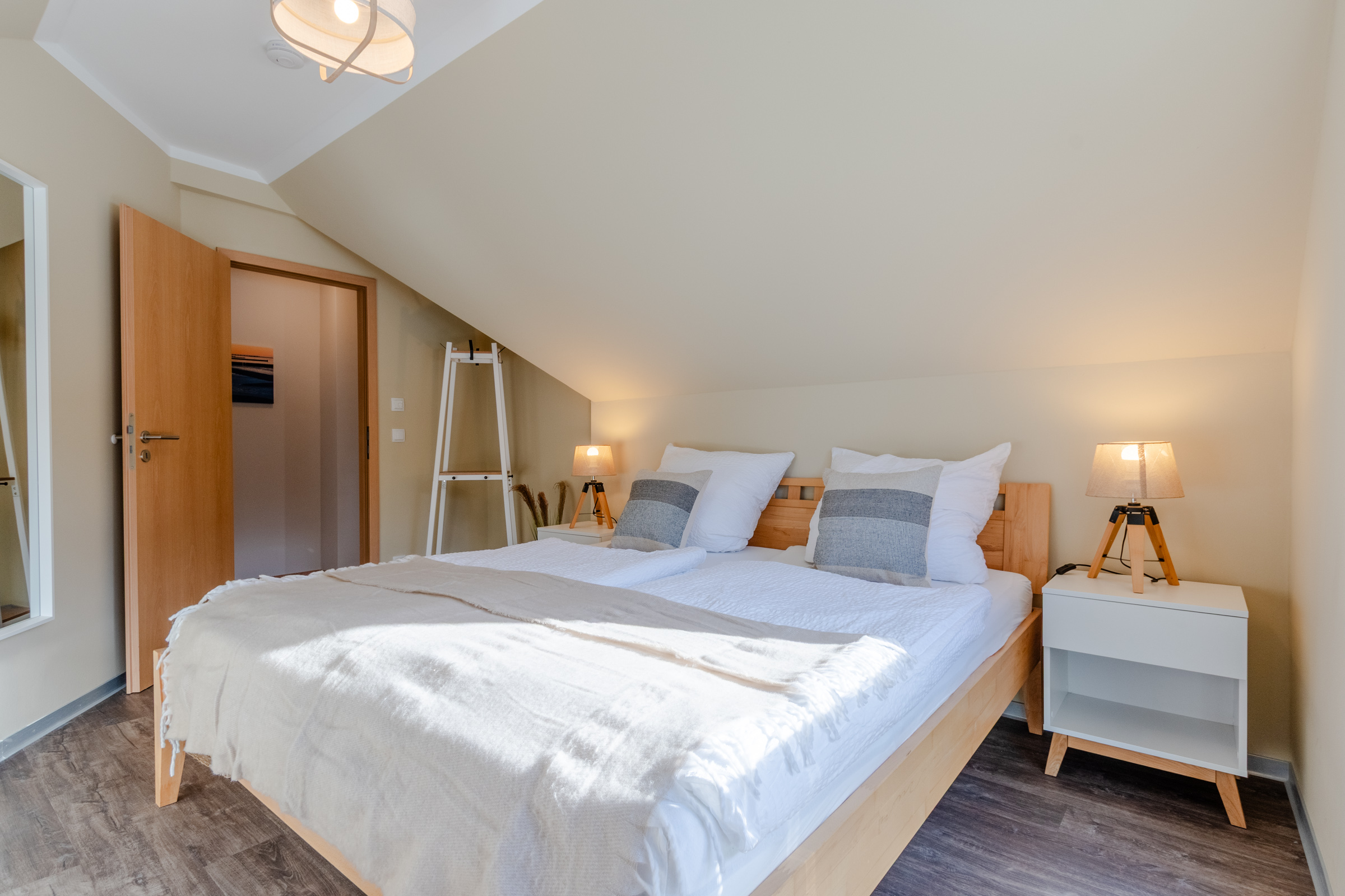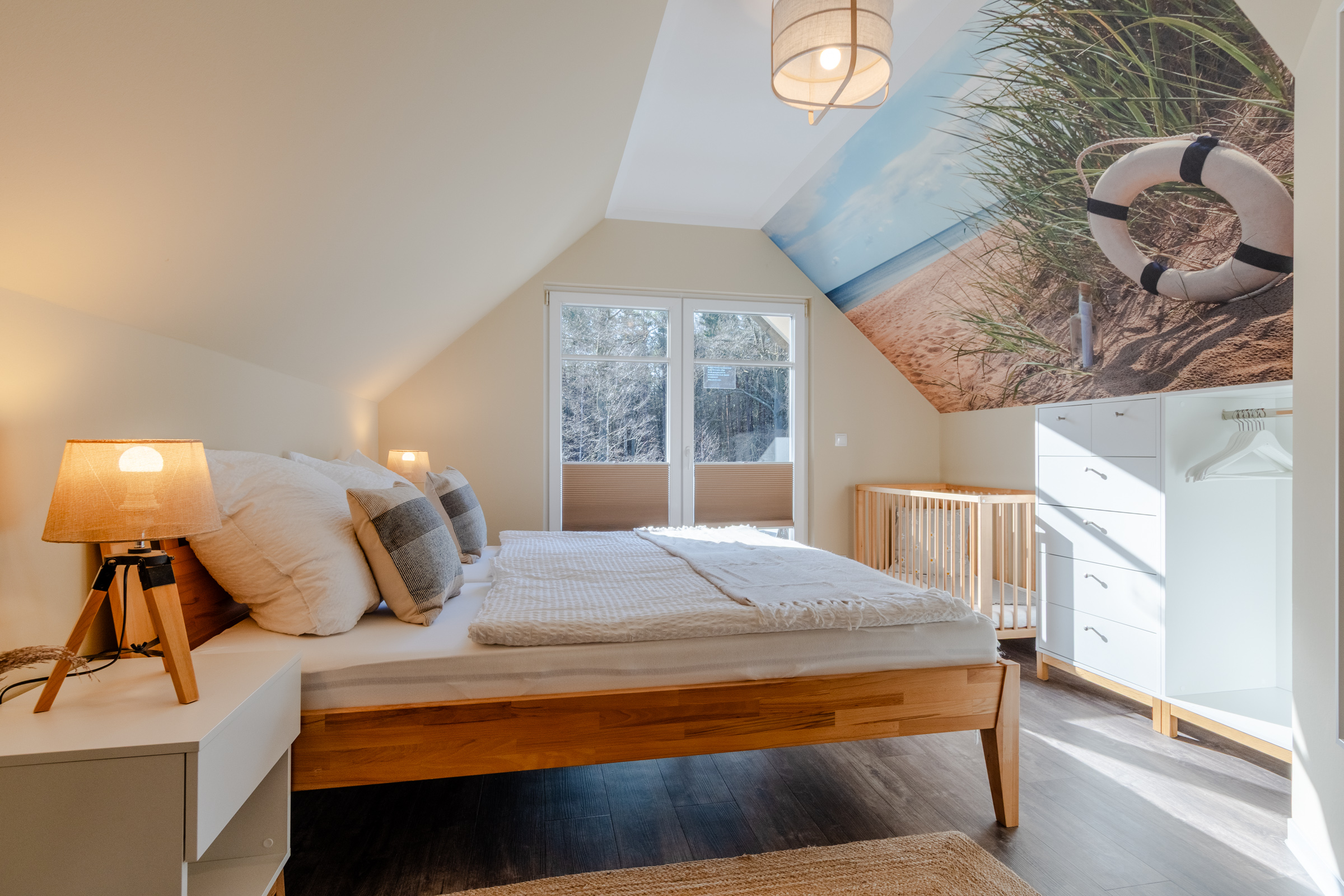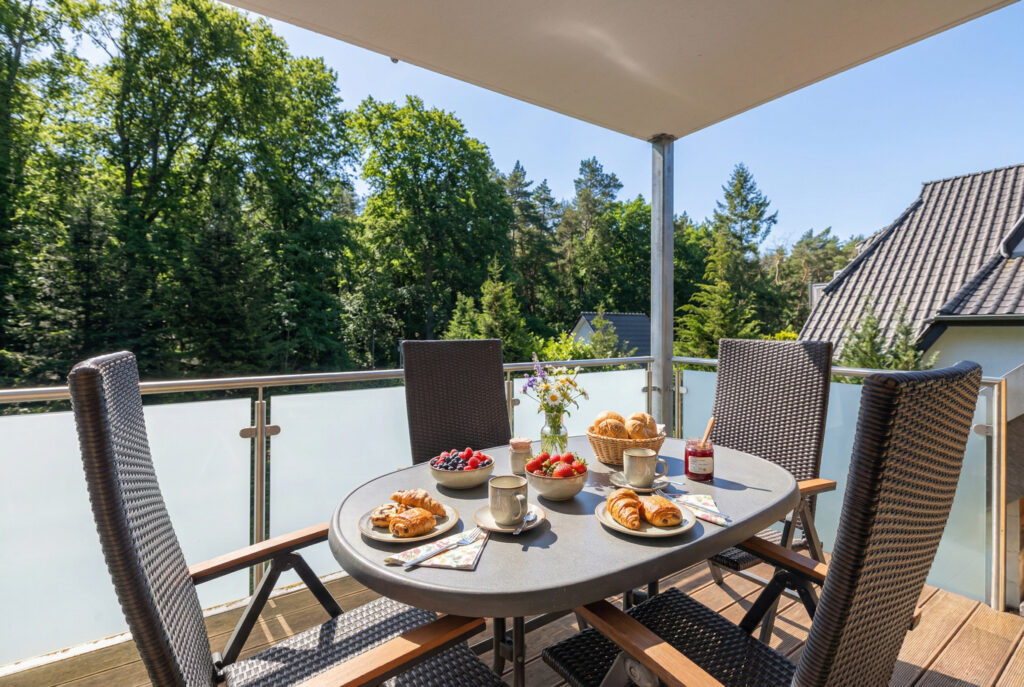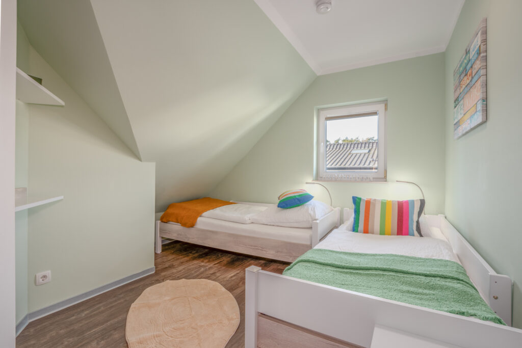 Die Wohnung erstreckt sich über 2 Etagen im Ober- und Dachgeschoss und bietet Platz für bis zu 4 Personen, verfügt über ein gemütliches Wohnzimmer, Schlafzimmer mit Doppelbett 180×200 cm, 2. Schlafzimmer mit 2 schönen Einzelbetten 90×200 cm und Schrank, Bad mit privater Sauna und 2 Balkone mit herrlichem Blick auf den Küstenwald. Sie ist deshalb eine Oase der Ruhe und Erholung- ideal für Ihren Familienurlaub. In dieser Wohnung ist ein Haustier gegen Aufpreis erlaubt.